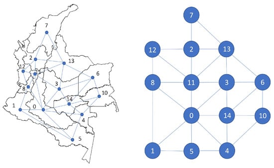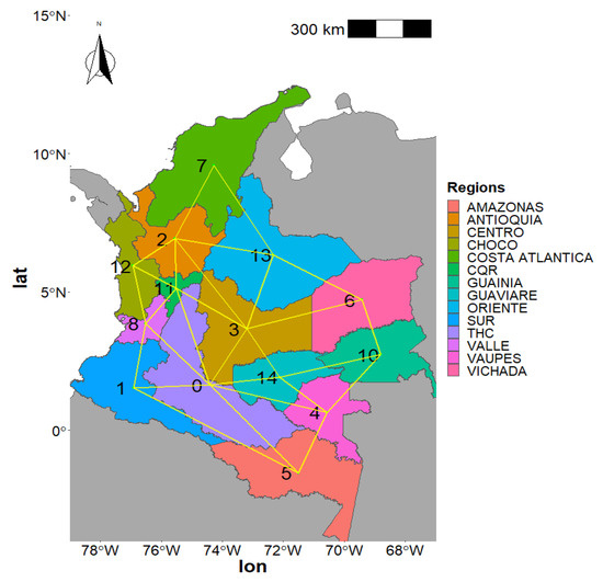 Figure 2 represents an areal data neighbourhood structure with 14 nodes or regions such as and with 29 as the set of edges or boundaries between regions