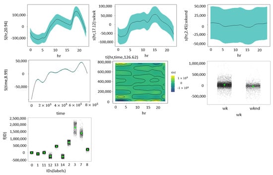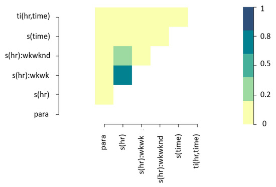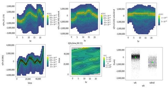 Initially, the daily pattern was included in the model using a cyclic spline smooth over the discrete variable hour with a range from 0 to 23, . After this, the weekly pattern was included in the model as a categorical variable, wk, where weekly days were classified as 1-Monday and 7-Sunday, and were aggregated into two factors, . The corresponding interaction between the discrete numerical variable that accounts for the daily pattern, hr, and the categorical variable, wk, that accounts for the weekly pattern was also included using a factor smooth-interaction with the argument inside the smooth function, s, in the following way . Finally, trend pattern was fitted not by using the month’s numeric notation from 1 to 12 or the days of the year from 1 to 365, but through a trend variable that goes from 1 to 43,800, that accounts for the total number of data points available days per years per hour between 2013 and 2018 through a cubic spline smooth . The interaction between the daily pattern and the trend pattern was fitted using pairwise bivariate tensors product interactions .
