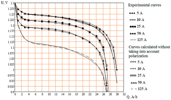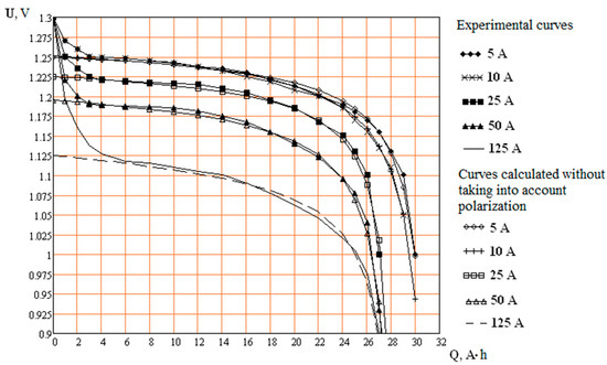 - The resistances of the free sections of the electrodes and the EMF of the electrode reactions are determined from the condition of coincidence of the calculated voltage curve with the experimental one for the considered discharge current and ambient temperature in sections II and III (Figure 3) corresponding to the steady-state concentrations of the electrolyte.