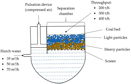 The efficiency of particle separation in the jig is influenced by many practical and hydrodynamic variables, as well as factors related to the feed characteristics, such as the coal’s physical and textural properties (particle shape, hardness, surface roughness), granulometric and densimetric composition, and chemical features. Hydrodynamic variables include water consumption (hutch water, transport water, and general water), water pressure, and rheological properties of the medium in terms of its density, viscosity, and solids content. There are also aerodynamic variables affecting the operational performance, such as the frequency and amplitude of the pulsation motion, along with the air pressure used to generate the pulsation [2,3]. The amount of material fed into the jig and its densimetric composition play an important role in the quantity and quality of the coal concentrate produced (i.e., calorific value, ash, and sulfur contents). Due to changes in the flow rate of the enrichment material, there are changes in the absolute position of the density layers of the bed. For instance, if the flow rate of the bottom product (tailings) is constant, it leads to fluctuations in density separation and, consequently, to a deterioration in the concentrate quality when the separation density is higher than the set point. If may also result in a loss of concentrate in the waste when the separation density is lower than the set point [4]. In addition, the use of jig feed stabilization systems should ensure stable conditions for coal-particle loosening in subsequent pulsation cycles and minimize coal particle dispersion in the jig bed [5]. The results of the experiments showed that the amount of additional water needed to properly loosen the jig bed during pulsating motion was necessary to occupy the appropriate equilibrium layers by the particles according to their density. These results were related to the grouping of particles by density from the heaviest in the lower layers of the bed to the lightest in the upper layers, and thus the separation into products: concentrate, excess, and tailings [6,7].