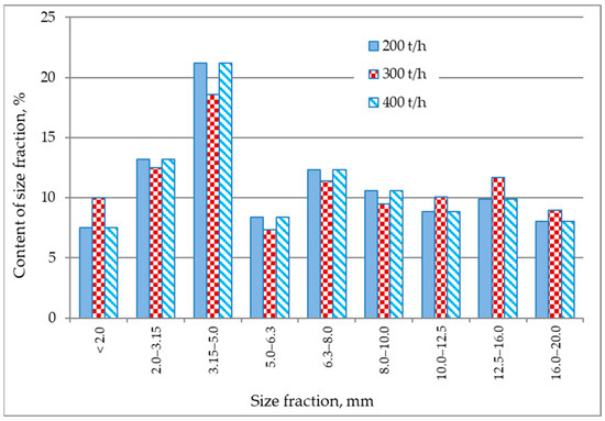 The following factors were used to evaluate the jig’s efficiency: the quality, expressed by the ash content in the concentrate; the amount of product-concentrate yield; and the accuracy of the separation process itself, measured by the imperfection index in each narrow particle size fraction. When changing the settings of the jig operation, i.e., changing the amount of material supplied for enrichment, samples of the feed were taken and sieved on the same screens as the enrichment products to check the uniformity of the feed in terms of its particle size distribution. The particle size distribution of the feeds is shown in Figure 2. A significant increase in the content of particles was observed in the 3.15–5.0 mm feed size fraction, while the content of the corresponding particle size fraction in the feeds differed from each other in the range of 0.6–3.0% in the individual trials. When analyzing the variability of particle size for size fractions in individual trials at different performances, a constant level of the content of the finest particles <2.0 mm and size fractions above 5.0 mm was observed. The relative standard deviation was used to determine the degree of uniformity of the feed: