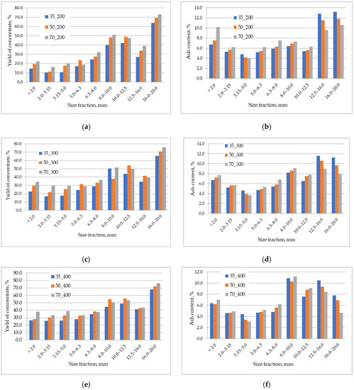 Concentrate yield and ash contents in the concentrate as a function of particle size fraction: (a) yield of concentrate—throughput 200 t/h, (c) yield of concentrate—throughput 300 t/h, (e) yield of concentrate—throughput 400 t/h, (b) ash content—throughput 200 t/h, (d) ash content—throughput 300 t/h, (f) ash content—throughput 400 t/h.