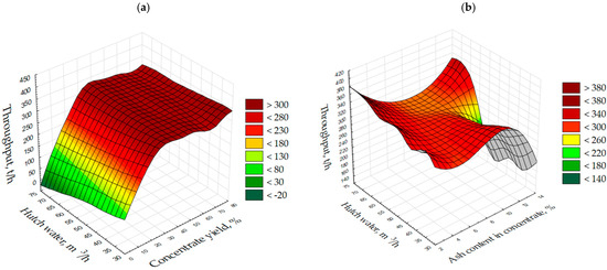 Three-dimensional surfaces of the analyzed variables for all cases: (a) influence of throughput and hutch water on concentrate yield, (b) influence of throughput and hutch water on ash content in concentrate, (c) influence of throughput and hutch water on imperfection.