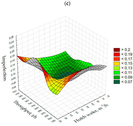 Meanwhile, in the enrichment process of coal in a jig with a pulsating work bed in a water medium, there are a number of variables that determine its progress. These are related to the properties of the feed, machine settings, and the hydrodynamics of the process [55]. Therefore, to illustrate how and to what extent the analyzed parameters determine the separation in the jig, a multi-parameter analysis was performed. The analysis considered variables such as the jig throughput, which is determined by the material flow rate, the amount of hutch water, the quality of the concentrate and the amount of concentrate, and the imperfection. A three-parameter analysis was performed over the entire range of variability, which also allows predicting, within a certain range of variability of individual parameters, the results of separation for individual variables. Figure 4a–c presented three-dimensional diagrams of the variability of the system Figure 4a (concentrate yield-axis x, hutch water-axis y, throughput-axis z), Figure 4b (ash content-axis x, hutch water axis y, throughput axis z), and Figure 4c (hutch water-axis x, throughput-axis y, imperfection- axis z). Figure 4a clearly shows that the yield of concentrate also enhanced with increasing the throughput. It depends to a lesser extent on the amount of hutch water added. Figure 4b shows that it was difficult to obtain a consistent trend in the variability of ash content in the concentrate as a function of yield and amount of hutch water. Therefore, the obtained surface was wavy and the analysis of the influence of the independent variables on the dependent variable should be performed separately for each particle size fraction. Figure 4c shows that the highest value of imperfection was obtained at higher values of the amount of hutch water and jig throughput. This relationship was also not homogeneous and it can be assumed that the quality of the feed can have a great influence on the obtained results.