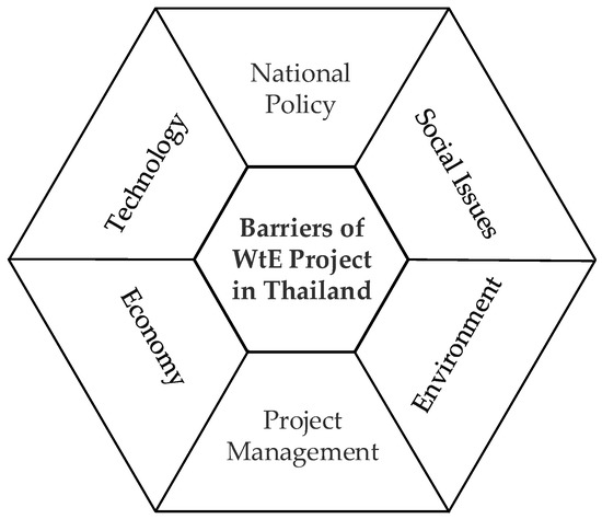 There are critical barriers which affect the success of WtE project development in Thailand. According to the literature review, study all barriers were classified into six sections as shown in Figure 5 [1,5,6,7,9,10,12,15,16,17,19,21,22,23,25]. The 20 barriers were gathered from the related literature, reliable agencies’ reports, and experts’ experience in the WtE field. The sources of barriers of this study are shown in Table 1.
