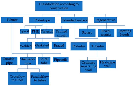 Heat exchangers (HXs) are devices that provide heat transmission between two or more fluids at different temperatures [1]. It is of great importance to ensure optimum performance as they are employed in a wide range of engineering applications, such as process, power production, food and chemical applications, manufacturing industry, refrigeration, air-conditioning, electronics, and space applications. Since they are so widespread, there are different types of HXs as well as different classifications have been proposed based on the construction, heat transfer process, surface compactness, flow arrangement, heat transfer mechanism, and number of fluids [2]. Figure 1 shows the most common classification according to construction.