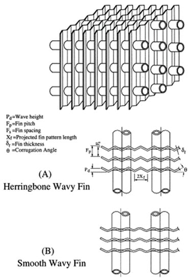 - Wang, C.C.; Fu, W.L.; Chang, C.T. Heat transfer and friction characteristics of typical wavy fin-and-tube heat exchangers. Exp. Therm. Fluid Sci. 1997, 14, 174–186. [Google Scholar] [CrossRef]