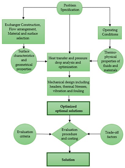 The design process of a heat exchanger is a very complex problem as there are many involved parameters to take into account, with complex correlations. Establishing a correct design procedure is the first step for designing an efficient exchanger and avoiding malfunctions. The design aim is certainly to satisfy the process requirements; therefore the designers must obtain all the information such as fluids flow rates, operating and maximum pressures, temperatures, and also all the constraints of cost, space, and types of materials. A schematic representation of a typical design procedure can be seen in Figure 3. Designers select the construction type of the device, geometry, and all the materials involved, taking into consideration not only the operating conditions but also issues concerning costs, maintenance, reliability, and safety of the device.