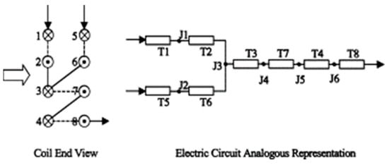 A general-purpose simulation and design tool (called CoilDesigner) using a “segment-by-segment” technique for air-to-refrigerant heat exchangers was developed by Jiang et al. [34]. The model can be applied to a generic finned tube coil (Figure 6) with an arbitrary refrigerant circuitry layout, numerous working fluids, and no limitations on the quantity and placement of the intake and outlet streams. The intersection where two tubes are connected together is referred to as a junction, and a junction-tube connectivity matrix is generated to represent the relationship between junctions and tubes (Figure 7). Each finned tube is divided into Nseg segments to account for non-uniform air distribution, heterogeneous characteristics, and heat transfer coefficients of the refrigerant (Figure 8). According to the order in which the refrigerant flows through the tube, the segments are numbered from 1 to Nseg. The authors validated the model by comparing the simulation results data coming from experimental investigations carried out by McQuiston [35], showing an overall agreement of 10%.