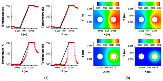 Temperature distribution along the longitudinal section of the fin (a) and over the whole surface (b) for increasing air heat transfer coefficient from 10 W m−2 K−1 to 10.000 W m−2 K−1 from top to bottom and from left to right [44].