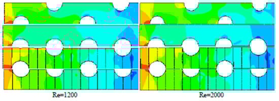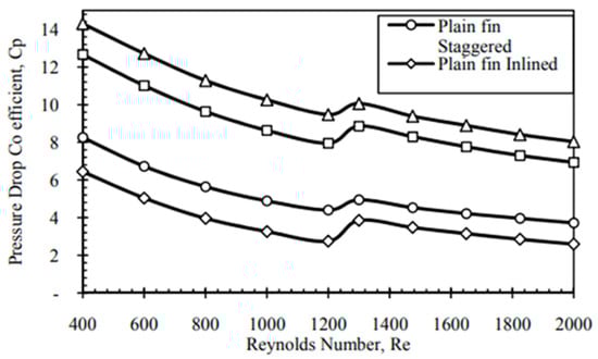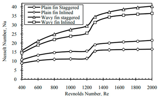 CFD codes are often employed to investigate the influence of geometrical parameters on the heat transfer and pressure drop characteristics of a chosen HX. A numerical investigation on a four-row finned tube HX with staggered/in-line tube arrangement and plain/wavy fins (Figure 10 and Figure 11) was carried out by Bhuiyan and Islam [65] by using the commercial CFD code, ANSYS CFX-11, for laminar and turbulent flows and the k-ω turbulence model for transitional flow. Results showed that higher heat transfer performance could be achieved with wavy fins, if compared to plain fins (Figure 12). However, wavy fin configuration results in lower pressure drops (Figure 13). The model was validated by comparing the simulated case’s friction factor, f, and Colburn factor, j, to experimental data from literature [66,67], achieving maximum deviations of 10.22% and 11.25% for friction factor and Colburn factor, respectively.