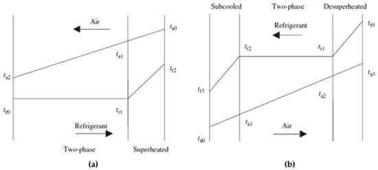 Shao and Zhang [82] focused on the dynamic variation of the number of zones of an evaporator or condenser (Figure 14), due to disturbance or oscillation in operating conditions. For instance, the superheated region in the evaporator can shorten or eventually vanish with the increase in the mass flow rate. Therefore, they developed a logic-unconstrained multi-zone model to describe the zone’s variation, where the traditional constraints were removed and substituted with continuously differentiable equations.