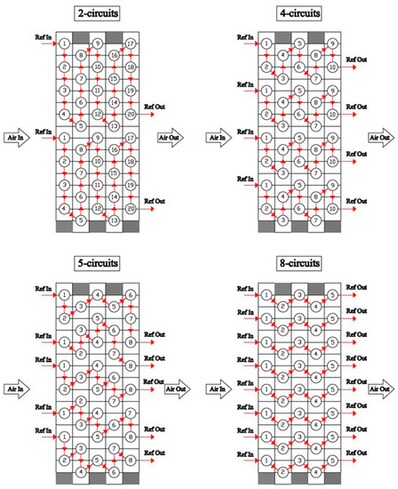 - Lee, W.-J.; Kim, H.J.; Jeong, J.H. Method for determining the optimum number of circuits for a fin-tube condenser in a heat pump. Int. J. Heat Mass Transf. 2016, 98, 462–471. [Google Scholar] [CrossRef]
