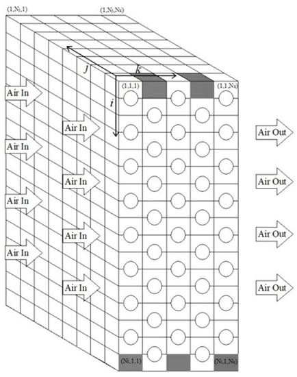 A model for simulating air-to-refrigerant heat exchangers that takes into consideration conduction through the fins was proposed by Singh et al. [44]. This model was created as a versatile and all-purpose simulation tool and is based on a segment-by-segment methodology. The heat exchanger is spatially simulated on a Cartesian grid to account for fin conduction, resulting in temperature distribution over the fin surface (Figure 9). The model’s prediction results are checked against experimental data collected from literature and experimental tests. Predicted temperatures on tube-bends agree within 3.9 °C and overall heat load agrees within a maximum of 5% with respect to measured data.