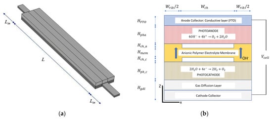 Figure 2a shows the 3D single PEC model depicted in the simulation software. It consists of an anode collector (the transparent FTO-coated glass), a photoanode layer, a segmented membrane, a photocathode, a GDL (gas diffusion layer) for hydrogen collection, and a cathode collector. The segmented membrane performs three functions, it operates as a solid electrolyte, retains the water in the channels, and allows the escape of gaseous species. The PEC’s elements are layered on each other, forming the geometric domain. They were parametrized in height and width in the x–z plane, according to Figure 2b; the length of the domain was defined along the y direction (Figure 2a).