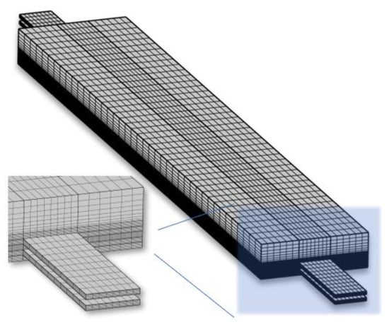 A structured mesh (Figure 3) was implemented for the model discretization; the mesh was refined at the inlet, outlet, and central part of the active area, in correspondence with the channel considered for the escape of the reactants. The adopted mesh consisted of about 300,000 rectangular elements.