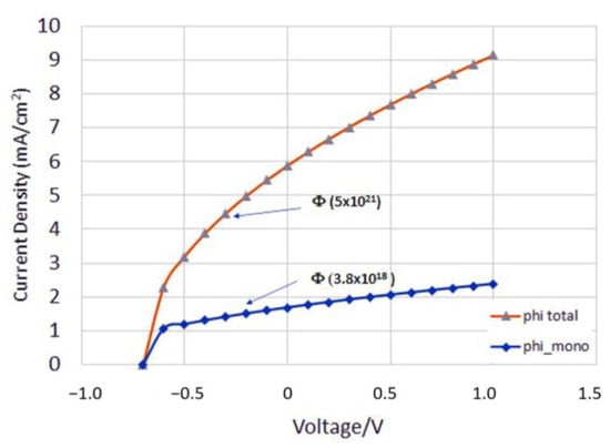 Figure 4 shows the I–V curve obtained from the continuum model, varying the voltage applied at the cell leads. The figure reports the current density at two different values of the incident photon flux, because the model solves the equations specifically for monochromatic light. In this case, the incident photon flux corresponds to and corresponds to the energy content limited to just one wavelength number (λ = 550 nm). By increasing the incident photon flux up to (that corresponds to the total spectra), the current density magnitude increases accordingly. In the case of a monochromatic incident photon flux, the maximum value of current density was about 2.3 mA/cm2; as expected, the full spectra generated a maximum current density of about 9.0 mA/cm2