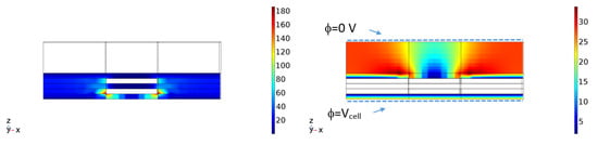 The current density distribution in the electrodes (electronic current) and electrolyte (ionic current) is shown in Figure 5, which is illustrated as a cross-section of the PEC model.