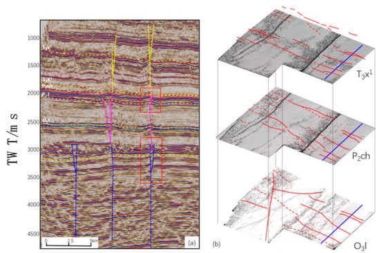 Typical seismic section showing three layered fault zones ((a); the blue, pink, and yellow lines showing the strike-slip faults in different layers; TWT: two-way travel time of seismic wave and different fault assemblages in different layers) and the strike-slip faults in three layers ((b); the red lines showing the strike-slip faults; the blue line showing the location of Figure 3a). T3x1: the Upper Triassic Xujiahe Formation; P2ch: the upper Permian Changxing Formation; O3l: the Upper Ordovician.
