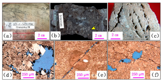 The reservoirs in the Changxing Formation are mainly reef–shoal bodies along the platform margins [17,18,19,20,21,22] (Figure 2). Most of the primary porosity in these reservoirs has been occluded by intense cementation during their long burial history (Figure 4d–f). More than 80% of the porosity is secondary dissolution of the pore and vug (diameter between 2–100 mm) (Figure 4). The fracture network is developed in the fault damage zone. Moreover, the fracture-related dissolution porosity is common in the cores and thin sections (Figure 4c,f). In the fractured reservoirs, most fractures present high angles and narrow apertures, whereas there are multiple set fractures with high and low dips, which form a complicated fracture network in the fault zone. A few wells have penetrated breccias in the fault damage zone (Figure 4b). The well T110 presented a system of complicated fracture–cave reservoirs (cave diameter >100 mm) in the logging data.