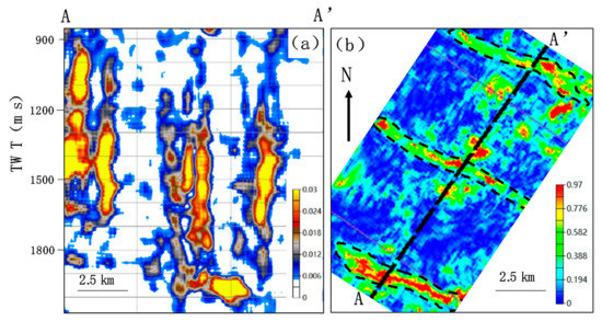 The strong anisotropic energy, showing the fractured reservoirs of the fault zones in the study area in a section (a) and in a planar plot (b) (the orange block shows the fractured reservoirs along the fault zone).