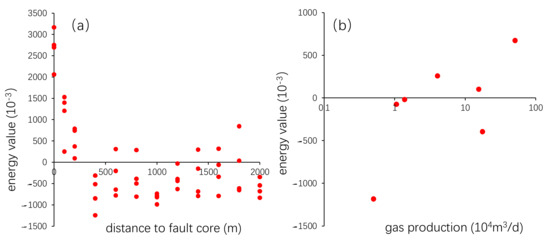Energy value from anisotropic energy vs. distance to fault core (a) and vs. gas production (b) in the carbonate platform margin.