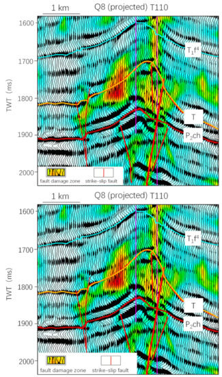 More than 10,000 km2 of 3D seismic surveys have been carried out along the Permian platform margins for purpose of carbonate exploration and development. Strike-slip faults have been identified in this study area, with the production of 1100 km2 of 3D pre-stack time-migrated data. In the Permian carbonates, the seismic bin is 25 × 25 m, and the dominant frequency is in the range 30–40 Hz, both of which are favorable for fault mapping and reef–shoal description [23,27].