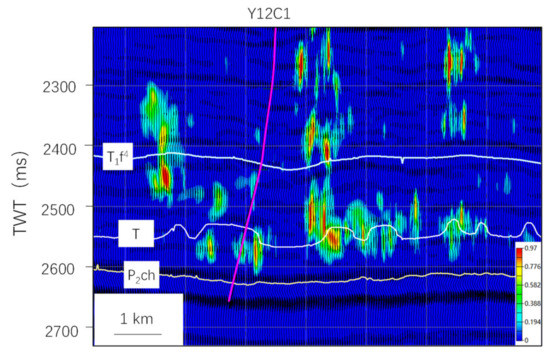 Seismic section with the energy parameter (green-orange color), showing the fault damage zone overlapping the reef–shoal along the Permian platform margin (T1f4: the fourth member of the Lower Triassic Feixianguan Formation; P2ch: the upper Permian Changxing Formation).