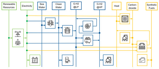 The first and second parts of the model correspond to green hydrogen production. The hydrogen produced by electrolysis can be stored at different pressure levels to balance and buffer the subsequent synthetic fuel conversion. The fluctuating renewable electricity can be stored in batteries as well to balance and increase the utilisation of the processes. It is also possible to store the clean water, as well as the synfuels in tanks. Synthetic fuels can be produced in various ways and various forms. The synfuel considered in this study is a mix of 62% diesel and 38% kerosene as a result of the Fischer–Tropsch synthesis of green hydrogen and carbon [13]. The carbon dioxide for the Fischer–Tropsch process is obtained from biomass and the atmosphere by direct air capture and can also be stored. The Fischer–Tropsch process produces slightly more waste heat than is needed for the direct air capture process. Finally, the produced synfuel will be transported by road to the nearest harbour for export.