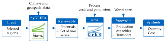 Figure 2 shows how different open-source tools and all input parameters are connected. First, a region of interest is defined to set the scope of the analysis. Based on the scope of the analysis, the renewable potential of photovoltaic, onshore wind, and biomass was determined by an open-source tool, pyGRETA [14]. Then, the results of pyGRETA as potentials and representative time series of renewable energy generation served as the input for the energy system optimisation performed by urbs [15]. Finally, the minimal costs from the optimisation were combined with the costs of transport to the nearest harbour for export.