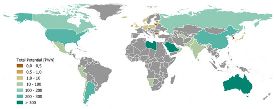 Further comparison to the literature showed that the results of this study are in the range of previous studies. Brynolf et al. and Shemme et al. concluded that the cost range would be EUR 200–280 /MWh in 2015 and EUR 160–210/MWh in 2030 [8,13]. The novelty and contribution of this work to the literature are that the production of synthetic fuels was investigated on a global scale. This analysis showed how renewable energy potentials such as for photovoltaics, wind power, and biomass influence synthetic fuels’ export costs. It was also shown that a mixture of photovoltaics and wind is favourable, except for countries with very good photovoltaic potential such as, for example, Australia. However, this study has some uncertainties and limitations. It is important to mention that the results presented were an outcome of decentralised and off-grid synthetic fuels’ production for the sake of simplicity. Competition and interaction with local energy demand needs to be considered, especially since direct use of renewable electricity is often more efficient and is thus more economical. For this reason, the cost potential curves at low costs will have a different course if the best renewable potentials are used to fulfil other demands instead and are not available for the production of synthetic fuels. Moreover, there is uncertainty concerning the technological development and costs in the future. This analysis showed that the export costs greatly depend on the process costs. Thus, the final export costs depend strongly on the underlying assumptions. It needs to be mentioned that our established toolchain is quite flexible and can be easily applied to other optimised energy systems at multiple scales.