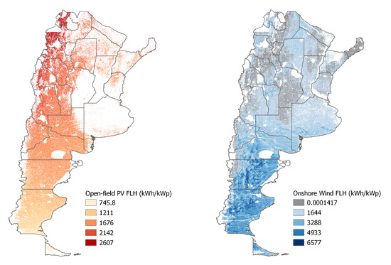 Exemplary full load hour maps of Argentina GID-1 level for open-field PV and onshore wind.