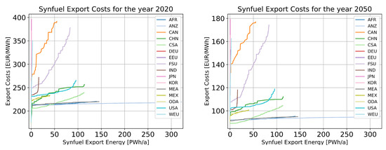 The supply curves in Figure 5 show the export costs dependent on the amount of exported energy of synfuels in 2020 and 2050. Economically favourable countries such as Australia (ANZ), those in Africa (AFR), the Middle East (MEA), and Central and South America (CSA) have a flat curve and start low. Countries such as Germany (DEU), Japan (JPN), and South Korea (KOR) have less potential and, hence, are economically unfavourable for the production of synthetic fuels. In total, large amounts of synthetic fuels compared to the global primary energy consumption of about 180 PWh are available up to EUR 250/MWh in 2020 and EUR 110/MWh mainly in Africa, Central, and South America, as well as Australia in 2050. The export costs are more than halved from 2020 to 2050.