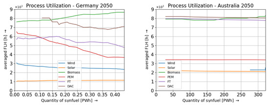 The full load hours of each technology for Germany and Australia in 2050 are shown in Figure 7. The full load hours in Australia are almost constant since mainly photovoltaics and wind energy only at the very end are used. In contrast to Australia, the full load hours in Germany decrease with the increasing amount of produced synthetic fuels. The utilisation rate of Direct Air Capture (DAC) is the highest of all processes for both Germany and Australia, but starts later in Germany because biomass is used as the carbon dioxide source first. The utilisation rate of the Fischer–Tropsch process is also quite high. The full load hours of PEM electrolysis are much higher in Germany at the beginning than in Australia because of the optimised photovoltaic and wind electricity mix. The full load hours of photovoltaics are almost constant, as expected, and of wind slightly decrease by the amount of synthetic fuel.