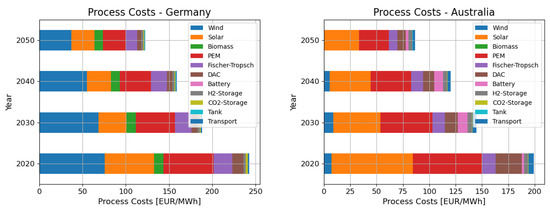 The process costs’ allocation and development for Germany and Australia from 2020 to 2050 are shown in Figure 8. In general, the main cost drivers are electricity generation, electrolysis, and conversion into hydrocarbons. The export costs can be reduced by approximately until 2050 due to reduced process costs and optimised processes, which are caused by the underlying assumptions for the technologies. Furthermore, the analysis also shows that the cost of the transport of synthetic fuels is about 1–2%, which is very low compared to the cost of production, as also shown in [36]. In Germany, the average export cost starts at EUR 240/MWh in 2020 and decreases to EUR 130/MWh in 2050. CO2 storage is used in combination with biomass because more CO2 is emitted than electricity is used for the synfuel production. Batteries are hardly used except for photovoltaic-dominant locations such as Australia.