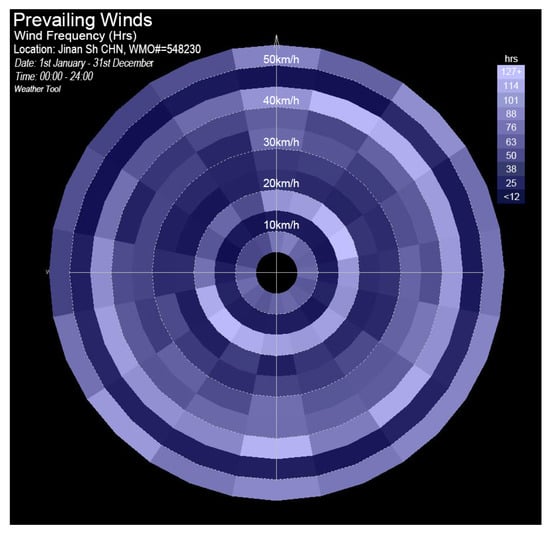 As shown in Figure 4, the region’s maximum annual wind speed is about 21 m/s. The different colours in the figure represent the total length of wind speeds at all levels throughout the year. Through a meteorological data analysis, we can obtain the meteorological conditions of Liaocheng City. This experiment simulated the typical working conditions of summer southeast wind by using Fluent and the technical aspects of the rationality of the temple’s layout. Since the main analysis object of this case is the external wind environment of the architectural complex, steady-state analysis can be adopted in the selection of the analysis type. The reference pressure is set to one atmosphere. Since the building outflow field is forced flow, it is unnecessary to consider the influence of gravity.