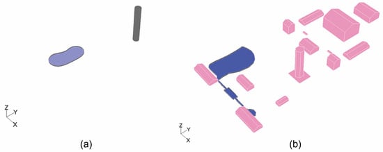 We use the Gambit modelling tool to establish the model for the temple group simulation. The plane simulation results at 1.5 m, 15 m and 20 m from the ground were selected to simultaneously analyse the central activity plane’s wind environment in the monastery. Figure 6 is a simplified model diagram before and after the planned transformation, of which (a) is a streamlined model before the planning and renovation, with only the ancient tower and a neglected pool. In the revised model, the old building is set as an octagonal cylinder with a radius r = 3.4 m, with a total height of 39 m (Figure 6a). The bottom elevation of the building is taken as the 0 elevation point. The level of the pool is −1 m. (b) Figure 6 is a simplified model for the CFD simulation of Xingguo Temple after renovation. In the modelling process, the main object of the analysis is the interior wind environment. The foundation is at 0 m, and the elevation of the water surface is −1 m. The ratio between the two models and the actual complex is 1:1.
