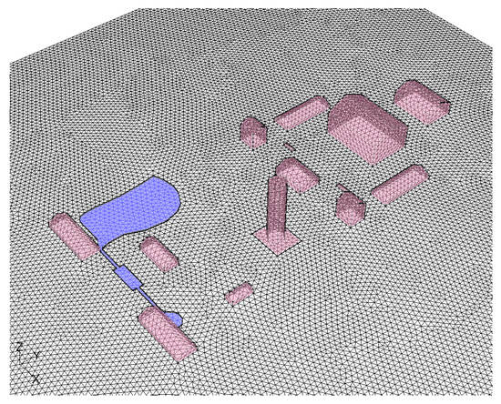 In the simulation process, the grid quality often affects the calculation’s accuracy and precision. Yoshihide’s research group compared the numerical analysis, wind tunnel test and measured results of 7 cases and summarised some principles of mesh partitioning in CFD calculations [38]. In this work, with the help of Gambit and the pre-processing software FLUENT, the flow field calculation area was divided into unstructured grids. The Gambit software has robust meshes that can be divided into high-quality meshes with special CFD requirements, such as boundary layers. Using Gambit software will significantly reduce the time required to build geometric models and flow fields and divide meshes during CFD applications, especially for generating unstructured meshes. The unstructured grids have no stable topological structure, many mesh shapes, and high flexibility, which is convenient for simulating complex underlying surfaces. In the test, relatively dense grids were first arranged on the walls of the buildings to adapt to the changes in the flow field. In contrast, relatively sparse grids were placed on the periphery of the architectural complex, and then the whole flow field was divided regionally from the surface to the volume. The grid division of the building surface and ground is shown in Figure 7.