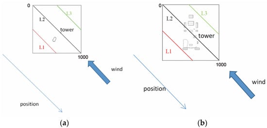 As shown in Figure 8a,b, a square having a side length of 400 m was selected as the observation area in the previously calculated location, and the entirety of the monastery may be included. Figure 8b shows the diagram after the transformation. In the same squares, we can select three straight lines parallel to the wind direction as the observation lines and observation points on the observation lines, denoted L1, L2 and L3; there are 410,943,410 observation points, and these points in the data are read for the analysis. In these two schematics, three lines, L1, L2 and L3, are in red, black and green, respectively. The L2 diagonal goes through the ancient tower. L1 and L3 observation lines are before and after the end of the square’s four sides. The wind pressure, speed and temperature values of the three wind observation points are read after the drawing analysis [53], as shown in Table 1, the comparative analysis table.