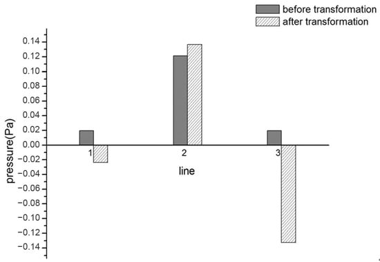 Figure 9 shows the average pressure change histogram on the three observation lines before and after the transformation. It can be seen that the moderate wind pressure at points on L1 and L3 has changed from positive to negative values, and significantly, L3 decreases the most. This is related to the impact of L3 on buildings, so corresponding measures should be taken in the area where L3 is located.