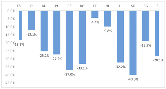 Their average recorded decrease in journeys in Germany amounted to approx. 27% in April 2020 (compared to April 2019). Higher declines in international transport were also recorded in neighboring countries, as well as France, Italy and Spain, in the same period, throughout the EU [1,2]. Figure 1 shows that carriers from neighboring countries also recorded significant decreases, although their dynamics were different. The smallest drops were experienced by German carriers, and the largest by carriers from Slovakia and the Czech Republic. These decreases were higher by several percentage points than among Polish carriers.
