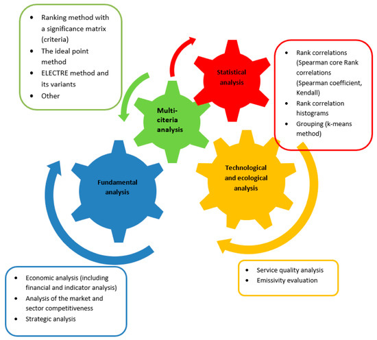 - Fundamental analysis [17,18], i.e., economic analysis with elements of macro-environment assessment, the main element of which is the financial analysis of LSPs, including the indicator analysis, often combined with the strategic analysis or market analysis [18,19].