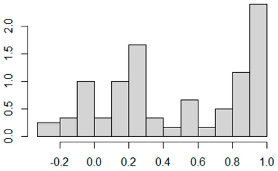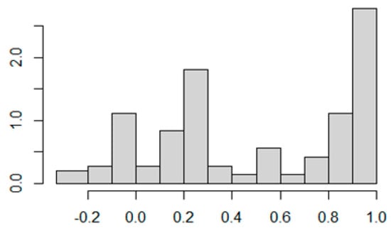 The rank correlation histograms for the studied values give the frequency of occurrence of specific values of the correlation coefficients, according to the principle “the higher the more often” it occurs. In the case of the ranking evaluations of LSPs, the same sets of variables appearing in subsequent years are usually adopted. The heights of the bars in the histogram are in this case proportional to the number of coefficients that belong to a given range, determined on the horizontal axis (X).