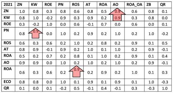 If it was decided to construct a synthetic measure of the ranking of companies, it would be necessary to select from among the indicators with the highest degree of correlation in the subgroups, or to assign them lower weights in the overall evaluation. The use of highly correlated indicators from the same subgroups may cause the duplication of certain types of information and increase its weight in the entire analysis.