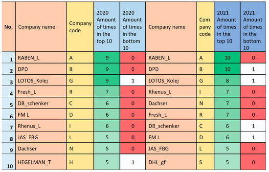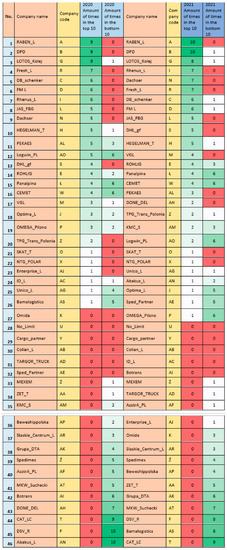 In addition, the signatures obtained for the 46 surveyed companies allowed to put them in the ranking. All entities are presented in the aggregated LSP ranking separately for 2020 and 2021. Scheme 3 shows the top ten (leaders) and Scheme 4 shows all the surveyed companies.
