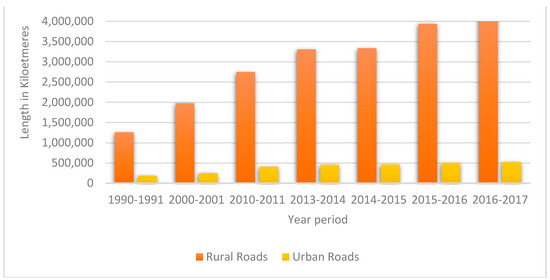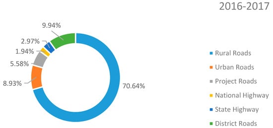 62]. Rural roads consist of Panchayati Raj roads (Zilla Parishad, Panchayat Samiti, Gram Panchayat), Pradhan Mantri Gram Sadak Yojana roads (PMGSY), and State PWD roads [