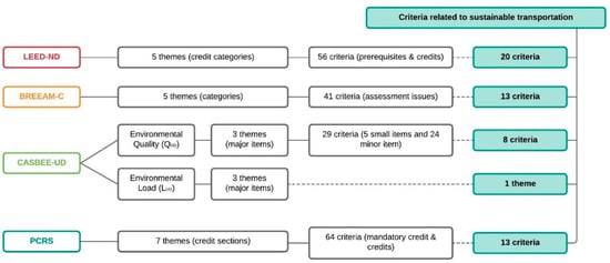 86]. All four USCs provide multiple requirements aimed at promoting active transportation directly and indirectly. They reflect 17 of the LEED-ND criteria, 11 of the BREEAM-C criteria, 13 of the PCRS criteria, and seven of the 29 QUD criteria of the CASBEE-UD section, as shown in