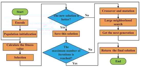 The GA algorithm is a highly parallel, random, and adaptive optimization algorithm. In order to obtain a better delivery scheme, we add the LNS algorithm [] to the genetic algorithm. The LNS algorithm can search for a better solution in the neighborhood of a solution. The flowchart of the GA-LNS algorithm is given in Figure 1. We will introduce the GA-LNS algorithm in detail to find the delivery scheme of each shelter.