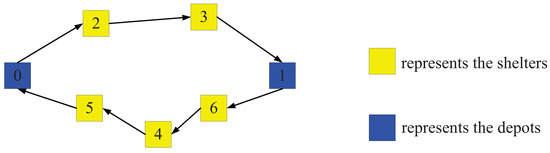 We assumed the number of shelters was five, the number of depots was two, and the number of vehicles was two. Figure 2 shows a feasible chromosome as 23,645, where the depot is denoted by 0, 1. The chromosome sequence is segmented according to the mathematical model constraints in Section 2. The chromosome may be divided into two parts. Part one is 23, and part two is 645. We calculated the distance between each depot and the first node A of each part, and added the nearest depot before A; at the same time, we calculated the distance between the last node B of each part and the depot, and added the nearest depot after node B. As shown in Figure 2, we generated two routes, ,.