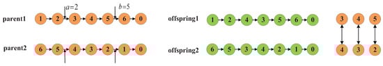 The process of crossover generating the new offspring is shown in Figure 4. We used the partial-mapped crossover approach to crossover the chromosomes. The crossover can improve the solution diversity. We give two parent chromosomes, randomly select two crossing positions a and b, such as , , and then the cross-fragment of parent two is exchanged with the cross-fragment of parent 1. It is noticed that there exists the repeated gene after crossover. We give the following corresponding relationship in the lower part of Figure 4. If the repeated gene occurs, change the first repeated gene observing the corresponding relationship.